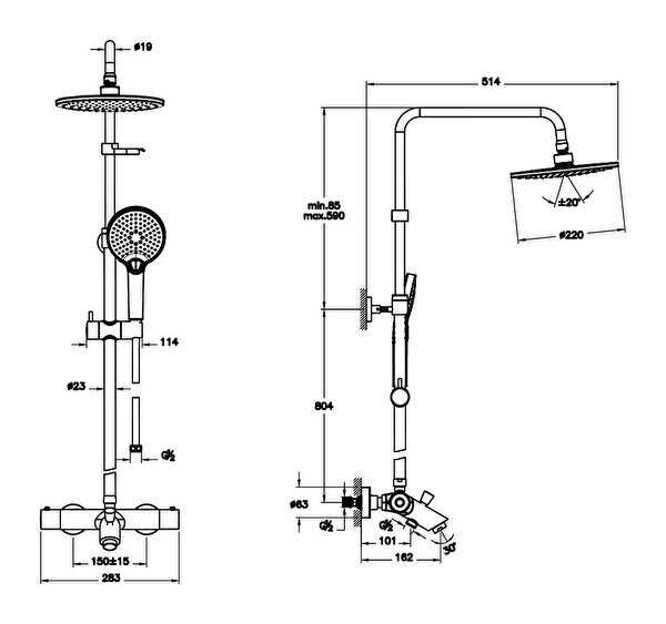 23 mm çapında ana kolon Duş başlığının yukarı-aşağı yükseklik ayarı için teleskopik özellik.
