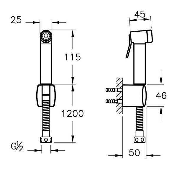 A45223 ankastre el duşu çıkışı veya 1/1" dirsek ile uygulanabilir. Tüm ankastre stop valf ve ara musluklar ile uyumludur. Metal el duşludur. Spiral uzunluğu 1200mm. El duşu ürüne dahildir. G3/8" - G1/2" adaptör ürüne dahildir.